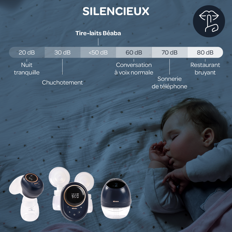 Discret et nomade : léger et compact il se cache dans votre soutien-gorge, et permet une utilisation discrète, grâce à sa technologie silencieuse (moins de 50 dB). Tirez ainsi votre lait où vous voulez et quand vous le souhaitez !